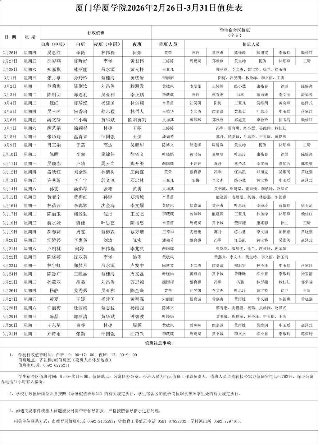 下一条:厦门华厦学院寒假值班表 2026年1月22日 -2月25日值班表
