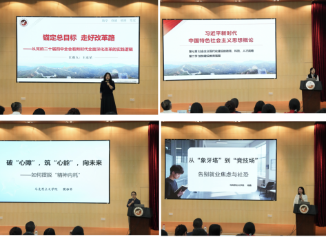 在集体备课环节,马克思主义学院王东星、肖孟君、樊雅琴、胡鑫等四位教师分别以“锚定总目标·走好改革路——从党的二十届四中全会看新时代全面深化改革的实践逻辑”“从教育大国迈向教育强国——用初心使命凝聚立德树人的磅礴力量”“破‘心障’,筑‘心能’,向未来——如何摆脱‘精神内耗’”“从‘象牙塔’到‘竞技场’:告别求职焦虑与社恐”为题,将党的二十届四中全会精神融入“习近平新时代中国特色社会主义思想概论”课程和“形势与政策”课程进行教学展示。
