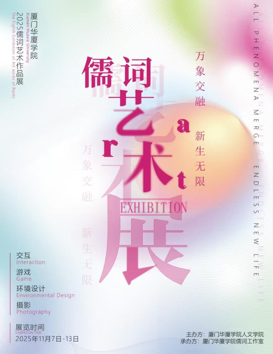 儒词展由人文学院主办,由厦门市华厦教育基金会提供资金支持,本届展览创作主题为“万象新生”,在科技与人文交织的时代,用创意捕捉变革中的光芒,用设计诠释新生的力量,让师生在展览中共同见证创意如何唤醒万象,点亮未来。展览在大方楼教学成果展示厅、常勋艺术馆和知新楼一楼三大展区共同展出,涵盖作品包括交互、文创、游戏、插画、包装、空间、影像在内的学生优秀毕业设计作品、获奖作品、课程优秀成果等。
